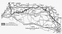 The Second Battle of the Aisne involved c. 1.2 million troops and 7,000 guns on a front from Reims to Roye, with the main effort against the German positions along the Aisne river.[4] The plan of December 1916 was plagued by delays and information leaks. By the time the offensive began in April 1917, the Germans had received intelligence of the Allied plan and strengthened their defences on the Aisne front. The German retreat to the Hindenburg Line Operation Alberich (Unternehmen Alberich) left a belt of devastated ground up to 40 km (25 mi) deep in front of the French positions facing east from Soissons, northwards to St. Quentin. Alberich freed 13 to 14 German divisions, which were moved to the Aisne, increasing the German garrison to 38 divisions against 53 French divisions.[5] The German withdrawal forestalled the attacks of the British and Groupe d'armées du Nord (GAN) but also freed French divisions for the attack. By late March, GAN had been reduced by eleven infantry, two cavalry divisions and 50 heavy guns, which went into the French strategic reserve.[6]