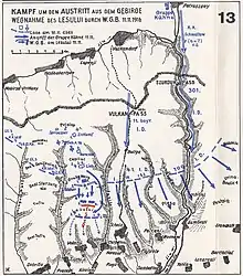 There is considerable disagreement between the German and Allied versions of the lead-up to the German breakthrough at the Jiu Valley. The Russian General Staff stated on 22 November that the German plan against Romania had completely failed, that Falkenhayn had failed at Predeal, and that he could only overrun Wallachia, instead of cutting it off in a pincer movement.[14] The German semi-official comment, however, claimed that it had never been the intention of their Supreme Command to break through in the southeastern Carpathian passes, trying to make out – in reaction to their defeats in the passes south of Brassó (Brașov) and on the Moldavian frontier – that these had always been part of a maneuver which aimed at attracting and binding Romanian forces in an area away from the Jiu Valley, the place singled out for the main attack. The truth was probably that the German Supreme Command acted on a plan which, if successful, would have achieved an overwhelming victory, but even if only partially carried out, would have given them the means to achieve remarkable though less overwhelming successes.[4]: 435 With the eastern Carpathian passes eliminated, the southern route from Brassó (Brașov) to Bucharest and the Danube offered the greatest potential for crushing the Romanian Army. Both the German and Austro-Hungarian commands favored this approach. However, the Romanians expected their enemies to choose that route, and accordingly they had constructed formidable defenses in the passes south of the city before the war started. Taking into consideration the worsening weather and the situation of the railways, Erich von Falkenhayn decided to achieve his breakout in the westernmost mountain passes. That being said, Falkenhayn had not entirely given up hope of breaking through the Romanian defenses south of Brassó (Brașov). He sent his divisions east and south of the city to both keep pressure on the Romanians and — with luck — break through the Romanian defenses. General Curt von Morgen, one of Falknehayn's subordinates, argued that much more of the Romanian Army could have been captured if a breakthrough would have been achieved at Câmpulung instead of the Jiu Valley. He insisted that this would have achieved "a real victory, a Cannae, a Tannenberg".[3]: 156–157, 300 Falkenhayn planned to apply pressure at several different points across the mountains and then exploit a success wherever it was achieved.[5]: 370–371