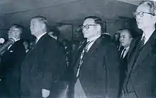 Proclamation of the Second Republic of Korea. From right: Chang Myon (Prime Minister), Yun Bo-seon (President), Paek Nak-chun (President of the House of Councillors) and Kwak Sang-hoon (President of the Chamber of Deputies)