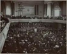 It was at the second Congress that two significant amendments were made to the representative bodies: The first was that women were allowed to become members and vote.[16] The second was that a delegation of socialists were admitted to the Congress.[17] The official admission of socialists to the Congress was significant in that it defied anti-zionist sentiment felt by Socialist groups prior to 1898. Previously, zionism was seen as antithetical to the socialist cause because the migration of Jewry to Palestine would remove working class Jews from the class struggle in their respective countries.[18] Additionally, it was believed that if socialism were to triumph, all forms of discrimination would be abolished, including anti-semitism, and the need for a Jewish State would become obsolete.[18] When the Socialist Zionists attended the Second Congress they demanded that working class Jews receive official representation in the WZO, and that the interests of international socialism would be considered.[19] Though they were initially met with opposition by Herzl who did not wish to create more factions in the Zionist body, they were finally admitted in 1898.[19]