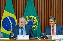 Lula has been criticizing the president of the Central Bank of Brazil, Roberto Campos Neto, for maintaining the basic interest rate at 13.75% per year, and has even considered ending the institution's autonomy in the future.[34][35] The presidents of the Senate and the Chamber ruled out this possibility.[36][37] According to some analysts, these attacks by Lula on the president of the BC are "a shot on the foot", as they would increase the inflation expectations of economic agents, resulting in more inflation in practice, in addition to increasing future interest rates, having an effect contrary to the intended.[38][39] Campos Neto, seeking to relax the relationship with Planalto, gave an interview in February to the program Roda Viva, on the TV Cultura, in which he adopted a calming tone, avoiding confrontation with the government.[40] In a survey carried out with financial market agents in March 2023, 94% reported not trusting Lula, while 68% said they trusted Campos Neto.[41]