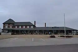 Sedalia station, also known as the Katy Depot, is a historic train station located at Sedalia, Pettis County, Missouri, United States. It was built in 1895 by the Missouri, Kansas and Texas Railroad. Designed by New York architect Bradford Gilbert, the depot is a 2 1/2-story, Romanesque Revival style red brick building on a limestone foundation. It has a two-story, modified octagonal primary facade, slate-covered hip roofs, and a broad encircling gallery. The station closed to passenger traffic in May 1958.[2]: 2, 13 The building houses the Sedalia welcome center.