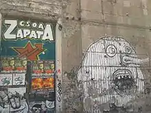 The first social centre in Rome was Hai Visto Quinto, created in 1985. Others in this time were Alice nella città, Blitz, Break Out, Ricomincio dal Faro, Intifada, and Zona Rischio.[6] As of 2014, Rome had many social centre projects, including Acrobax, Angelomai Altrove, Cinema America Occupato, Nuovo Cinema Palazzo, and Teatro Valle Occupato.[22] Metropoliz is a refugee squat occupied in 2009 that took the unusual step of opening a contemporary art gallery in 2012 as a means for the artists to support the squatters.[23] CSOA Forte Prenestino is an old fort in Rome which was squatted on 1 May 1986. It is a huge site which hosts a range of projects.[24]