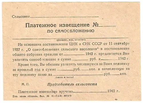 Soviet 1942 unused form of the payment notice for self-taxation.