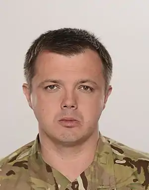 Semen Ihorovych Semenchenko (Ukrainian: Семен Ігорович Семенченко, born 6 June 1974) is a former deputy to the Verkhovna Rada of Ukraine, First Deputy Chairperson of the Verkhovna Rada of Ukraine Committee on National Security and Defence[3] and the commander-founder of the volunteer territorial defence battalion "Donbas", based in Donetsk.[4][5] He was a deputy of the Verkhovna Rada from 2014 to 2019.[6]