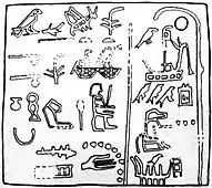 Semerkhet's birth name is more problematic. Any artefact showing his birth name curiously lacks any artistic detail of the used hieroglyphic sign: a walking man with waving cloak or skirt, a nemes head dress, and a long, plain stick in his hands. The reading and meaning of this special sign is disputed, since it doesn't appear in this form before association with king Semerkhet. Indeed, the hieroglyph of the cloaked man is extremely rare. It appears only twice in relief inscriptions depicting ceremonial processions of priests and standard bearers.[4][5] Egyptologists such as Toby Wilkinson, Bernhard Grdseloff, and Jochem Kahl read Iry-Netjer, meaning "divine guardian". During the Old Kingdom period, this word is written with uniliteral signs of a netjer flag (Gardiner-sign R8) and a human eye (Gardiner-sign D4) nearby the ideogram of the man. Some contemporary ivory tags show the Nebty name written with the single eye symbol only. Thus, the scholars also read Semerkhet's throne name as Iry (meaning "guardian") and the Nebty name as Iry-Nebty (meaning "guardian of the Two Ladies"). This reconstruction is strengthened by the observation that Semerkhet was the first king using the Nebty title in its ultimate form. For unknown reason Semerkhet did not use the Nebuy title of his predecessor. It seems that he felt connected with the 'Two Ladies', a title referring to the goddesses Nekhbet and Wadjet, the patron deities of the Ancient Egyptians who were worshiped by all after the unification of its two parts, Lower Egypt, and Upper Egypt. The Nebty title in turn was thought to function as an addition to the Nisut-Bity title.[5][6][7] His prenomen is Nisut-Bity-Nebty-Iry, nsw.t-bty-nb.ty-iry meaning, King of Upper and Lower Egypt, he of the two ladies, and he who belongs to them or He whom the two ladies guard.[1]