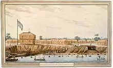 In April 1801, he was promoted to a lieutenancy in the 49th Regiment, and shortly afterwards sailed for Quebec. Whilst he was in Canada he used his artistic skills to sketch not only landscapes but also made a valuable record of the wildlife and the local dress.[3] Stretton's 1804 sketch of "York Barracks, Lake Ontario, Upper Canada, 1804" is credited as being one of the earliest pictures of what was to become the city of Toronto.[5] Lieutenant Stretton served under Colonel Isaac Brock, who selected him to act as his aide-de-camp.