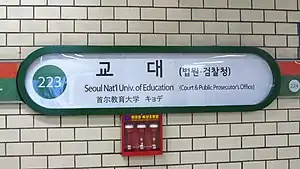 Seoul Nat'l Univ. of Education Station is a station in the Seocho District of Seoul, on Seoul Subway Line 2 and Line 3. It is usually noted on station signs and on-board announcements that the station serves (the Supreme) Court & Prosecutors' Office.