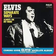 "Separate Ways" is a 1972 song by Elvis Presley written by Red West and Richard Mainegra. Elvis Presley recorded the song on March 27, 1972, and released it as a single with "Always On My Mind" as the B-side. It reached gold status in the US for sales of over half a million copies. It was listed as a double sided hit reaching #16 on Billboard magazine's Hot Country Singles chart in November 1972.[1] In the UK "Always On My Mind" was the hit song and "Separate Ways" was the B-side.
