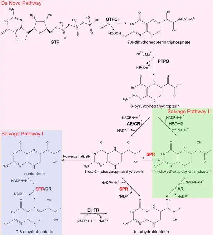 - ↑ Wu Y, Chen P, Sun L, Yuan S, Cheng Z, Lu L, Du H, Zhan M (September 2020). "Sepiapterin reductase: Characteristics and role in diseases". Journal of Cellular and Molecular Medicine. 24 (17): 9495–9506. doi:10.1111/jcmm.15608. PMC 7520308. PMID 32734666.