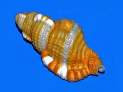 The shell size of Septa rubecula varies between 25 mm and 55 mm.[2] These moderately small shells are commonly rather solid, ovate and vetricose. The six convex whorls are sculptured with one varix on each whorl and with spiral cords, nodules and knobs. Siphonal canal is moderately long. The external shell surface is quite variable in color. It may be bright or dark red, orange or brown with a small white or yellowish transversal band on whorls and with small white patches on varices. The outer lip is ornamented with 8–10 white prominent denticles. The columella is reddish. The inner surface of the aperture is white. The periostracum is yellowish-brown.[5]