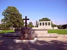 A memorial to the victims of the siege was opened the right of the main cemetery entrance on 27 January 1965, the 21st anniversary of the lifting of the siege.[4] A four-span portico sits on a high base, with five monumental sculptures depicting the defenders and workers of Leningrad. In front of the portico is a granite cube with an eternal flame and a platform paved with black labradorite. It stands on the site of sixteen mass graves from the time of the siege.[1][2][5] The Piskaryovskoye Memorial Cemetery is the usual place for the main commemorations of the siege, with the Seraphimovskoe Cemetery often commemorating other military events, including Victory Day on 9 May, the anniversary of the withdrawal from Afghanistan (15 February), the deaths of troops from the 76th Guards Air Assault Division in the Battle for Height 776 during the Second Chechen War (1 March), the Day of the Airborne Forces (2 August) and the foundation of the OMON (4 October).[3]