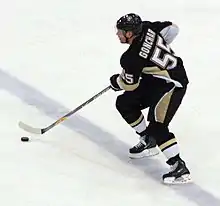 During the first game of the 2008–09 pre-season, Gonchar was hit into the boards by David Kočí in a game against the Tampa Bay Lightning, dislocating his shoulder. It was reported that he would miss four to six months after opting for arthroscopic surgery.[8] While both Gonchar and defense partner Brooks Orpik claimed the hit was late, well after Gonchar had completed a pass, it was judged by Penguins' head coach Michel Therrien to be a clean hit and that Kočí had simply "finished his check".[9][10] With the Penguins struggling to make the playoffs, Gonchar returned to play his first game of the season on 14 February 2009, against the Toronto Maple Leafs after being sidelined for 21 weeks.[11] He played in the final 25 games of the regular season and tallied 19 points, helping the Penguins into the 2009 playoffs as the Eastern Conference's fourth seed. However, playing in game four of the conference semi-finals against the Washington Capitals, Gonchar suffered a serious knee injury with a knee on knee hit by Alexander Ovechkin . Despite being initially expected to be out for several weeks and possibly the remainder of the playoffs,[12] Gonchar returned for game seven of the series.[13] Gonchar and the Penguins went on to win the Stanley Cup in seven games, facing the Detroit Red Wings for the second consecutive year. After winning, he revealed he had been playing with a partially torn medial collateral ligament (MCL).[14]