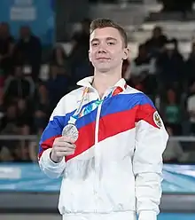 ![]() Sergei Naidin winning the silver medal in the all-around final of the 2018 Summer Youth Olympic Games | |