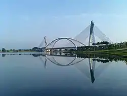 The Seri Saujana bridge, also called Bridge No 8,[1] crosses Putrajaya Lake, an artificial lake made to provide natural cooling, and connects the Core Island (Precinct 4) to the Precinct 7 on Lebuh Sentosa highway. It is strategically located at the main entrance into the Core Island from the south, via the upgraded