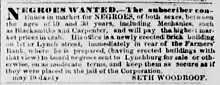 Seth Woodroof (c. 1805 – August 4, 1875) was a slave trader based in Lynchburg in central Virginia, United States. He was an interstate trader who ran what the Lynchburg Museum called the "most active and infamous"[1] slave pen in the city. He is believed to have been actively trading from approximately 1830 until the beginning of the American Civil War in 1861. Woodroof sat on the Lynchburg city council from 1858 to 1865.
