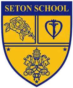 ![]() Seton School's crest, a shield divided into three parts: the Papal Keys, a rose (signifying the Virgin Mary), and the symbol of the Daughters of Charity of Saint Vincent de Paul, a branch of which was founded by the school's patron.[1] | |