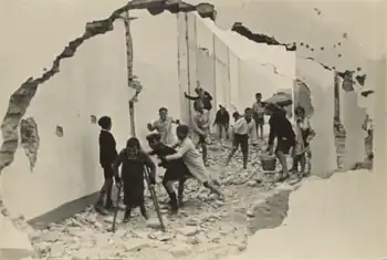 The picture does have a strong geometric form, influenced by Cubism and Surrealism. It depicts a group of fourteen children, most of who play naturally in the rumble behind a bomb destroyed wall, from which can be seen other damaged buildings. The destruction itself seems to be a significant testimony of the political turmoil of the Second Spanish Republic. The empty portion of the white, stuccoed wall works as a frame to the scene, from which we can see a smiling child walking with crutches, while several other children engage in playful behaviour. To the left, a boy holds a bucket because he is collecting the rubble that resulted from the destruction. Despite their joyful appearance, the picture seems to represent a political subcontext, which makes sense considering that the Spanish Civil War started only three years later.[4]