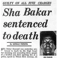 On 2 September 1975, Justice A V Winslow and Justice D C D'Cotta delivered their verdict. In the verdict, which was read out by Justice Winslow, the trial judges found that there was sufficient evidence to prove that Sha Bakar was indeed at the scene of crime, firing his gun at bystanders in the brothel and getting into the gunfight with police. Therefore, they rejected Sha Bakar's alibi defence, and also made a finding that Sha Bakar did not injure his arm from the motorcycle accident, but from the shoot-out. Since Sha Bakar had intentionally fired his gun in order to cause harm to the police and civilians, the two judges therefore found him guilty of all five counts of discharging a firearm to cause hurt under the Arms Offences Act, making Sha Bakar the first person to be convicted under the Act since 1973. Consequently, 37-year-old Sha Bakar bin Dawood was sentenced to death for each of the offences which the trial court found him guilty of.[31][32][33]