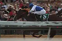 on board. He defeated Take Charge Indy by one length in the 1-1/8 mile race that he completed in a time of 1:49.12 seconds.[29][30]