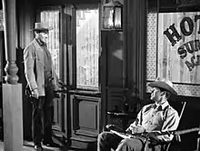 ![]() Brothers Bart (Jack Kelly) and Bret Maverick (James Garner) exchanging glances at the Hotel Sunny Acres. | |