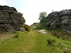 ![]() Salters Nick, running through Shaftoe Crags, viewed from the north-west. The remains of the Iron Age and Romano-British settlement are on the right, above the crags. | |