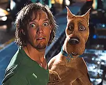 Shaggy and Scooby make a cameo appearance in the 2003 live-action/animated film Looney Tunes: Back in Action, where Shaggy berates Matthew Lillard over his portrayal of Shaggy in the 2002 live-action film and threatens to "come after" him if he screws up in the sequel.[52]