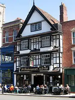 Shakespeare Inn is a 17th-century pub on Victoria Street, in Bristol, England. It is a timber-framed house, dated 1636 on the front, which was extensively restored in 1950, under the direction of F.L. Hannam,[1] and re-roofed in 1992. It has been designated by English Heritage as a grade II listed building.[2]