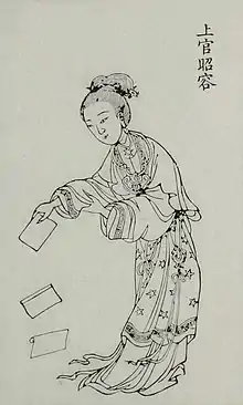 Shangguan Wan'er (664 – 21 July 710)[2] was a Chinese politician, poet, and imperial consort of the Wu Zhou and Tang dynasties. Described as a "female prime minister,"[3] Shangguan rose from modest origins as a palace servant to become secretary and leading advisor to Empress Wu Zetian of Zhou. Under Empress Wu, Shangguan exercised responsibility for drafting imperial edicts and earned approbation for her writing style. She retained her influence as consort to Wu's son and successor, Emperor Zhongzong of Tang, holding the imperial consort rank of Zhaorong (昭容). Shangguan was also highly esteemed for her talent as a poet.[4] In 710, after Emperor Zhongzong's death, Shangguan was killed during a palace coup that ended the regency of Empress Dowager Wei.