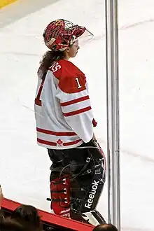 She was a member of the 2009–10 Hockey Canada national women's team which won the gold medal at the 2010 Winter Olympics and earned two shutouts, including the final game against the United States women's national ice hockey team.[16] She was selected to the tournament all-star team at the Olympics, and was named top goaltender.[17] In a March 31, 2012, exhibition game versus the United States, Szabados made 24 saves in a 1–0 shutout win at the Ottawa Civic Centre.[18]