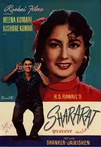 Shararat (meaning "Mischief") is a 1959 Hindi romantic drama film written, produced and directed by H. S. Rawail. It stars Raaj Kumar, Kishore Kumar, Meena Kumari, Kumkum in lead roles, with the memorable song "Hum Matwale Naujawan" sung by Kishore Kumar.[1][2] Here, Meena Kumari matched the boisterous Kishore Kumar. This film is also unique because in addition to Kishore Kumar singing his own songs, two versions of a classical raga based song ("Ajab Hai Daastaan Teri Yeh Zindagi") that were picturized on Kishore Kumar were sung by Mohammad Rafi, on Kishore Kumar's insistence.