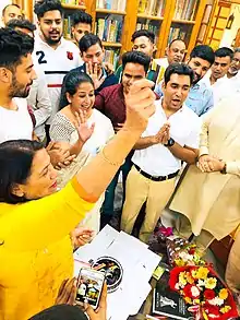 Sharmistha joined the INC in July 2014. Since then she has been actively participating in rallies organized by the party and working at the grass root level with the party workers in her area.[4] She contested the Delhi Assembly election in February 2015 from the Greater Kailash constituency[5] but lost, coming third with 6,102 votes after Saurabh Bharadwaj (AAP, 57,589 votes) and Rakesh Gullaiya (BJP, 43,006 votes).[6] Mukherjee quit active politics in 2021.[7]