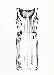 In fashion, a sheath dress is a fitted, straight cut dress, often nipped at the waistline with no waist seam.[1] When constructing the dress, the bodice and skirt are joined together by combining the skirt darts into one dart: this aligns the skirt darts with the bodice waist dart.[2] The dress emphasizes the waist as its skirt portion is fitted. While the sheath dress can come in many patterns and lengths, it often is worn with short sleeves and reaches knee length.[3]