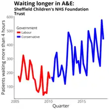 Four-hour target in the emergency department quarterly figures from NHS England Data from https://www.england.nhs.uk/statistics/statistical-work-areas/ae-waiting-times-and-activity/