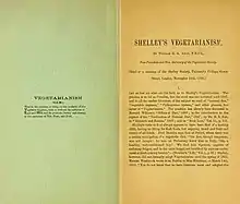 The 15 x 22 centimeter sewed pamphlet was covered in paper wrapping, and was published and circulated the year following Axon's lecture to the Shelley Society, by the Vegetarian Society, at 75 Princess Street, Manchester.[13] It is 13 pages in total length, excluding advertisements and notes by the Vegetarian Society. An edition was published by bibliophile Thomas J. Wise in the same year.[14] By 1908, the cost of one copy of Shelley's Vegetarianism was 2 shillings.[15]