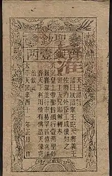 The currency of the Taiping Heavenly Kingdom (traditional Chinese: 聖寶; simplified Chinese: 圣宝; pinyin: Shèngbǎo; lit. 'Holy treasure')[1] consisted of Chinese cash coins and paper money,[2] although the rarity of surviving Taiping paper money suggests that not much was produced. The first cash coins of the Taiping Heavenly Kingdom were issued in the year 1853 in the capital of Tianjing (present day Nanjing). The cash coins of the Taiping Heavenly Kingdom should not be confused with the Taiping Tongbao (太平通寳) which was issued during the Northern Song dynasty between the years 976 and 997,[3] or with any other contemporary rebel coinage that also bear this inscription.[4]