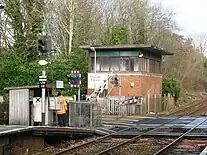 In 1960 the signal box was replaced by a new one on the opposite side of the line, but after this a decline set in. From 1963 the line was transferred to the Western Region, and in that year the Reshaping of British Railways report was published. The smaller stations were soon closed, and most trains beyond Exeter St Davids were diverted to other routes. The gas works had stopped receiving coal in 1957 and all goods traffic was stopped from 18 April 1966. On 7 May 1967[1] the 21 miles (34 km)[2] to Chard Junction was reduced to single track, but this proved a mistake and the double track was restored as far as Yeovil Junction on 1 October. The signal box was closed on 4 January 1970 when the level crossing was converted to lifting barriers which were for many years controlled by a member of staff from a panel at the end of the eastbound platform.[1] In March 2012 a modern signalling system for the Salisbury-Exeter line was commissioned and the line, including crossings, is now controlled remotely by the Basingstoke Rail Operating Centre.[3] Remote control of the crossing eliminated the need for constant staff presence at the station during train operating hours, allowing South West Trains to reduce the hours of ticket office staffing.[4]