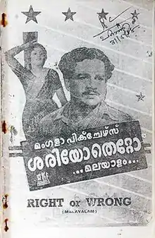 Sheriyo Thetto is a Malayalam-language film released in 1953 under the production of Mangala Pictures. The film was directed, written and dialogues by Thikkurissy. The movie was directorial debut of Thikkurissy. Though the movie was not a commercial success it was noted for its camera and editing. It is also the debut film of Adoor Bhavani, Meena Sulochana, Jose Prakash as actor, and dance director N. Damodaran. The camera work is done by M. R. Ranganathan and the dances were choreographed by Ramunni as well as N. Damodaran.