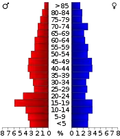 In the county, the population was spread out, with 24.60% under the age of 18, 11.80% from 18 to 24, 23.90% from 25 to 44, 22.80% from 45 to 64, and 17.10% who were 65 years of age or older. The median age was 38 years. For every 100 females there were 104.50 males. For every 100 females age 18 and over, there were 101.40 males.