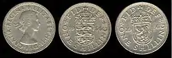 1956 Elizabeth II UK shilling showing English and Scottish reverses