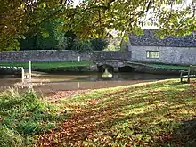 Traditional houses and cottages in Shilton are built of local Cotswold stone. Shilton House was built in 1678[10] and is a Grade II* listed building.[16] Elm Farm dates from 1683.[10] Shilton Bridge across Shill Brook is a small stone hump-back bridge that was probably built in the 18th century.[17] By the 1930s its stonework had become decayed, it was too narrow for modern traffic and its hump was too acute for some vehicles.[18] In 1938 Oxfordshire County Council rebuilt the bridge, making the road across it wider and reducing the hump.[18] The sides of the bridge were rebuilt using the original stones in their original relative positions as far as possible, while the widening of the bridge was achieved by inserting a concrete section in the middle of the road hidden from view.[18]