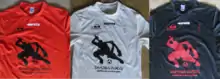 The club displays for the 2016–2017 season a red and black shirt at home, black shorts and black socks. These colours refer to both two of the three colours of the Belgian flag (red and black) and to the colour of which the Japanese "shinobi" are traditionally depicted (black).[16] The previous "home" shirts were distinguished from the current ones by two little yellow stripes on the shoulders, to complete the reference to the colours of the Belgian flag.[17] There are two other shirts, worn depending on the trips or the colours of the opposite team in order to better make the difference between the two teams on the field; these shirts are also worn when the prime team of the club plays against the second one, which can happen with the contingency of the competitions. The first one ("away" shirt) is white and the second one ("third" shirt) is black. On the other hand, the shorts and the socks remain black whatever shirt is worn.
