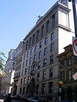 The building was designed by Harry S Fairhurst in a neo-classical style and displays some Art Deco and Edwardian Baroque motifs, such as square windows and roof sculptures which were prevalent during the 1920s.[2] It stands 46 metres (151 ft) tall with 11 storeys and is clad in Portland stone. It was one of the tallest office blocks in the United Kingdom when completed in 1927.[3] The building built by J. Gerrard & Sons Ltd of Swinton was Grade II listed in 1982.[4] Ship Canal House was sold in 2011 for £22.8 million.[5]