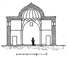On the opposite side of the door, between the branches of the cross there are two small rooms inside the thick stone walls. It is supposed to be used as a cell or warehouse where the tomb items were stored.[8] The external side of the dome covering upper part of the middle of the hall were decorated with glazed tiles. However, those tiles do not currently exist.[7]