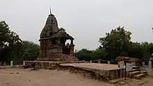 The east-facing Shitala Mata temple was built in about 12th century.[1] It has three parts: mandapa, antarala and garbhagriha (sanctum). The platform has friezes of kirtimukha, elephants, humans and deities. The doorframe of the sanctum has images of Vishnu in five niches in top section and while images of Laxmi in niches in the side sections. On the exterior walls of the sanctum, there is an image of Parvati in south niche and the images of Mahishasurmandini (Chamunda) in north and west niches.[2] The vedika (altar), kakshasana (seatings), small pillars and the ceiling of the mandapa are decorated with fine carvings.[1] A bust of an image is enshrined in place of the original image in the sanctum which is worshiped locally as Brahmani or Shitala Mata.[1][2]