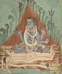 In Tantrik cult, Shmashana, emerged to be a main area of their experiments called Shava sadhana.[3][4] Aghoris and Kapalika are some of the people who indulge in such rituals in Shmashana. They invoke Kali, Tara, Yogini, Chausath Yogini, Dakini, Bhairava, Bhairavi and ghosts like Vetala, Pishacha, Brahm-Rakshasha and worship them, give them sacrifices in Shmashana to have occult powers. They consider these deities as Shmashana Adhipati.
