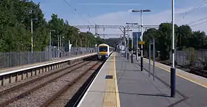 Shoeburyness is arranged in a through-station layout despite being a terminus. It was opened on 1 February 1884 by the London, Tilbury and Southend Railway. As a result of this layout, the station has step-free access from the town's high street to all of its platforms. Platforms 1 and 2 have an operational length for thirteen-coach trains and Platform 3 an operational length for nine-coach trains.[2] A connection exists to the Ministry of Defence site nearby at Pig's Bay, to the east over a level crossing on the high street, and extensive carriage sidings exist to the west comprising 31 sidings.[2]