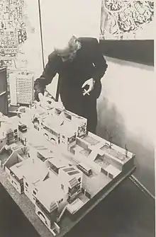 Kavlashvili was among the most prolific Georgian architects of the Soviet period. His works include some of the most inventive civic architecture in the capital city of Tbilisi, including the Laguna Vera swimming complex and the Central Bus Station. Kavlashvili also served as Chief Architect of Tbilisi (1970-1974; 1980-1990), overseeing the preservation of Old Tbilisi and the creation of the country's first urban historic district in 1975. In 1994, he was appointed Vice-Mayor and Chief Architect of Poti.[1] In recognition of his efforts, the city renamed a street in Old Tbilisi after Kavlashvili, and his statue (by sculptor Tengiz Kikalishvili) was added outside the old city gates on Baratashvili Street[2] in 1999.[3] He is buried at the Didube Pantheon of Writers and Public Figures in Tbilisi.