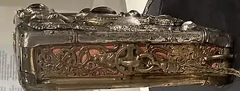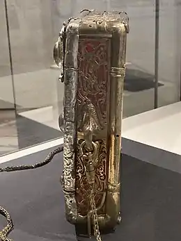 The Shrine of Miosach consists of a rectangular, 11th-century wooden box which was decorated in the 16th century by extensive and ornate metal plates and mountings, fixed to the wooden core with nails.[10] The early object may have been built to hold a relic or religious texts such as psalms or extracts from a Gospel,[11] and would have been sized to suit the particular manuscript or relic.[6] However it was empty when first described in detail in the 18th century, and there is no surviving record of what it may have held.[10] Like most cumdachs, a format only found in Ireland and Scotland,[6] it was not designed to be opened but to enclose and protect a relic or text in its chamber,[1] while instilling, according to the art and architecture historian Rachel Moss, "wonder in the observer".[12] Its dating to the last quarter of the 11th century is based on stylistic similarities to the 1084 AD cumdach built to contain the Cathach of St. Columba.[13][14] It still has the original metal cord used for carrying it; the length of which indicates that it was probably intended to be worn around the neck.[4] There are late 11th century cast copper alloy plates on each side, decorated with openwork zoomorphic illustrations,[10] whose designs show the influence of the Ringerike style.