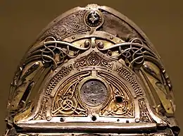 The top of the crest is lined with a hollow gilt bronze cap with extended wings terminating in animal heads.[19] Its mid-portion conations the heads of two confronted birds in profile with raised wings.[20] The center of its main section contains a large blue glass boss (or stud) holding a cloisonné (held in place by strips of wire) insert. The center of the panel to the right is decorated with zoomorphic interlace, while the center of the insert to the right is now empty.[19]